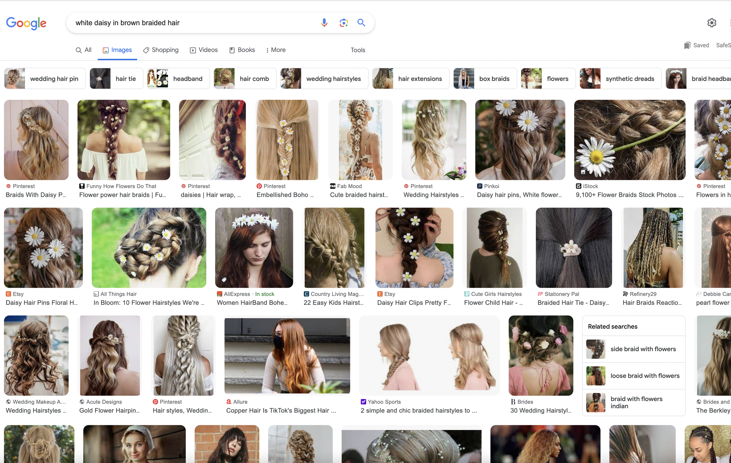 For example, say I’m looking to find a photo of braided bridal hair with white flowers, I’m looking for something to show my stylist but I just search up: